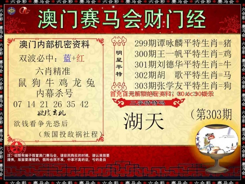 | 304期八肖 | 龙猪鼠狗牛鸡兔羊 | 开:發00 |